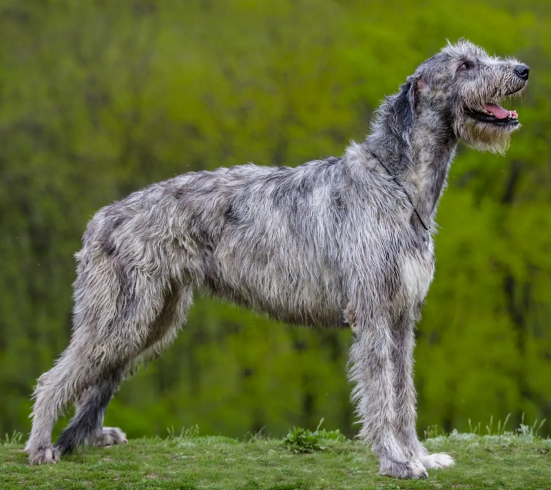The Irish Wolfhound is a giant-sized dog, one of the tallest breeds in the world, reaching the size of a small pony. The head is long and the skull is not too broad. The muzzle is long and somewhat pointed. The small ears are carried back against the head when the dog is relaxed and partway pricked when the dog is excited. The neck is long, strong and well arched. The chest is wide and deep. The long tail hangs down and is slightly curved. The legs are long and strong. The feet are round, with well-arched toes. The wiry, shaggy coat is rough to the touch on the head, body and legs and longer over the eyes and under the jaw. Coat colors include gray, brindle, red, black, pure white or fawn, with gray being the most common.