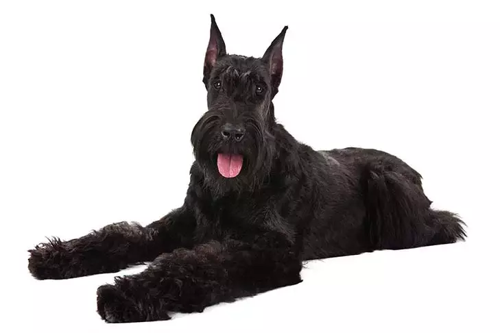The Giant Schnauzer is a large, powerful, compact dog. It looks like a larger version of the Standard Schnauzer. The dog’s height is the same as the length, giving it a square look. The head is strong and rectangular in appearance. The muzzle is the same length as the top of the head. The stop is slight. The large nose is black. The lips are black and do not overlap. The teeth meet in a scissors bite. The oval eyes are medium-sized, deep-set and dark. The ears are set high on the head and are either cropped or kept natural. When cropped they stand erect with a pointed tip. When left natural the ears are V-shaped, carried close to the head. The back is straight. The front legs are straight when viewed from all sides. The tail is set high and is usually docked to the second or third joint. Note: docking tails and cropping ears is illegal in most parts of Europe. Dewclaws are almost always removed from the back legs, and may be removed from the front if they are present. The double coat has a wiry, dense hard, outer coat with a soft undercoat. The hair stands slightly up off the back, with coarser, longer, bushy whiskers, beard and eyebrows. Coat colors come in solid black and salt and pepper.
